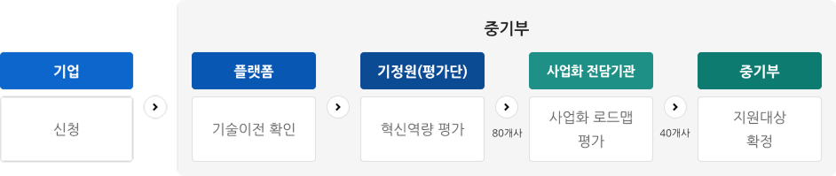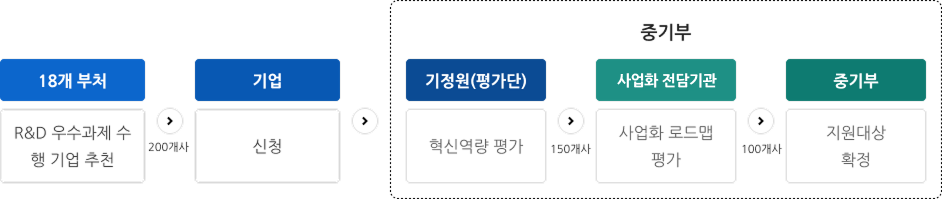 R&D 우수과제 수행 중소기업을 각 부처로부터 추천받은 후, 기업의 사업화 로드맵과 혁신역량 등을 평가하여 선발